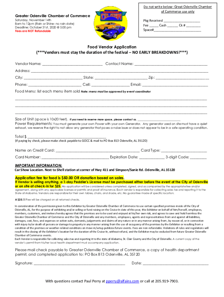Do not write below Great Danville Chamber of Commerce use only Greater Danville Chamber of Commerce Saturday, November 14th 8am to 12pm (Rain or Shine no rain date) Deadline: October 31st, 2020 @
