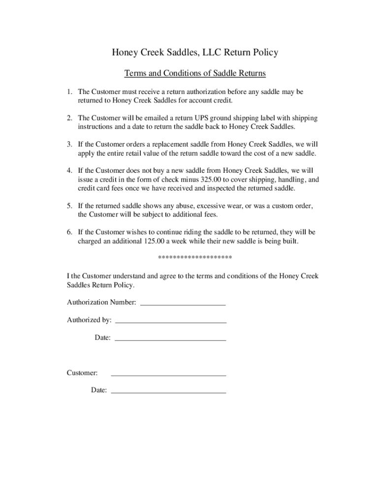 Honey Creek Saddles, LLC Return Policy Terms and Conditions of Saddle Returns 1. The Customer must receive a return authorization before any saddle may be returned to Honey Creek Saddles for account