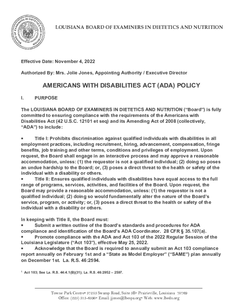 LOUISIANA BOARD OF EXAMINERS IN DIETETICS AND NUTRITIONEffective Date: November 4, 2022, Authorized By: Mrs. Julie Jones, Appointing Authority / Executive DirectorAMERICANS WITH DISABILITIES ACT (ADA)