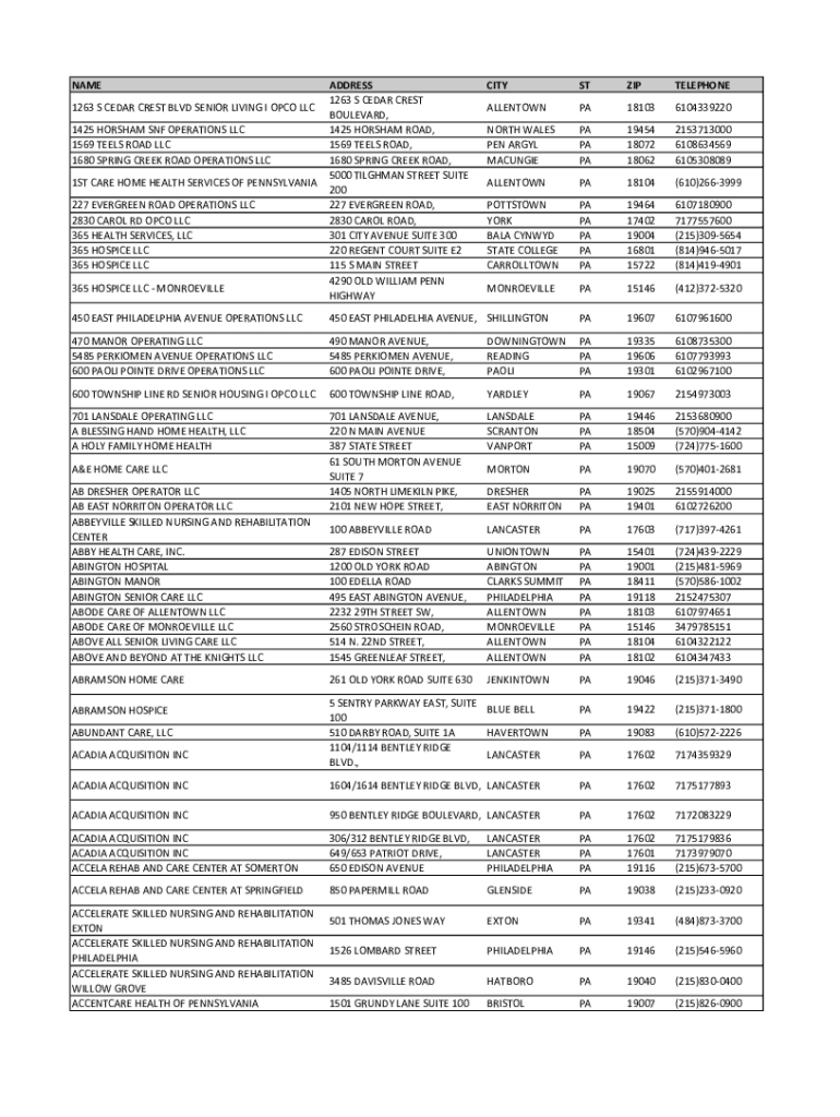 NAME 1263 S CEDAR CREST BLVD SENIOR LIVING I OCO LLC 1425 FORDHAM SNF OPERATIONS LLC 1569 TELLS ROAD LLC 1680 SPRING CREEK ROAD OPERATIONS LLC 1ST CARE HOME HEALTH SERVICES OF PENNSYLVANIA 227 EVERGREEN