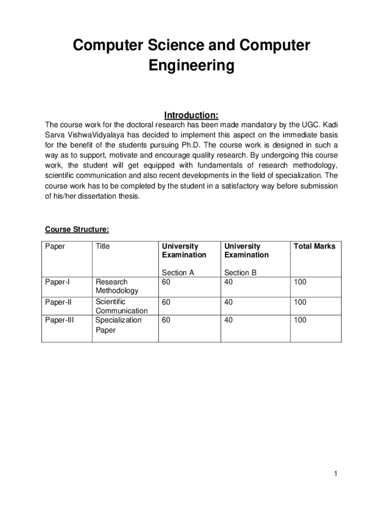 Computer Science and Computer Engineering Introduction: The course work for the doctoral research has been made mandatory by the UGC. Kali Sara VishwaVidyalaya has decided to implement this aspect