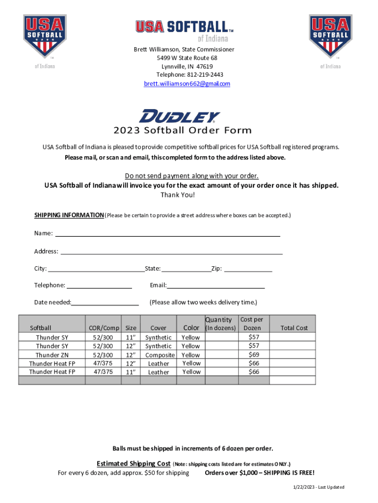 Brett Williamson, State Commissioner 5499 W State Route 68 Linville, IN 47619 Telephone: 8122192443 Brett.williamson662@gmail.com2023 Softball ORD her Form USA Softball of Indiana is pleased to provide