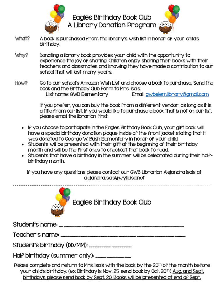 Eagles Birthday Book Club A Library Donation Program What? A book is purchased from the libraries list in honor of your children birthday. Why? Donating a library book provides your child with the