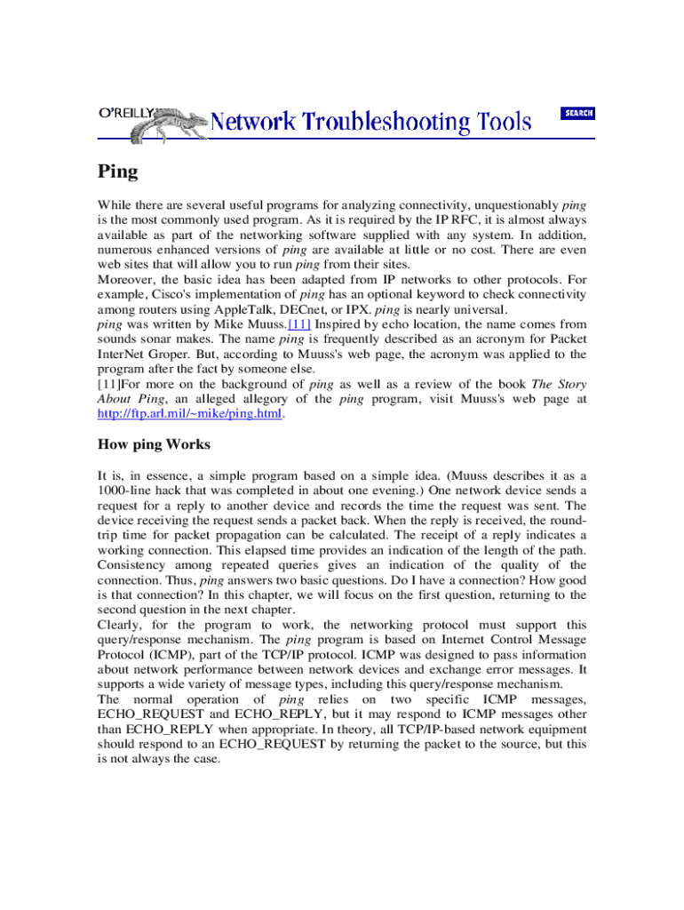 Ping While there are several useful programs for analyzing connectivity, unquestionably ping is the most commonly used program. As it is required by the IP RFC, it is almost always available as part