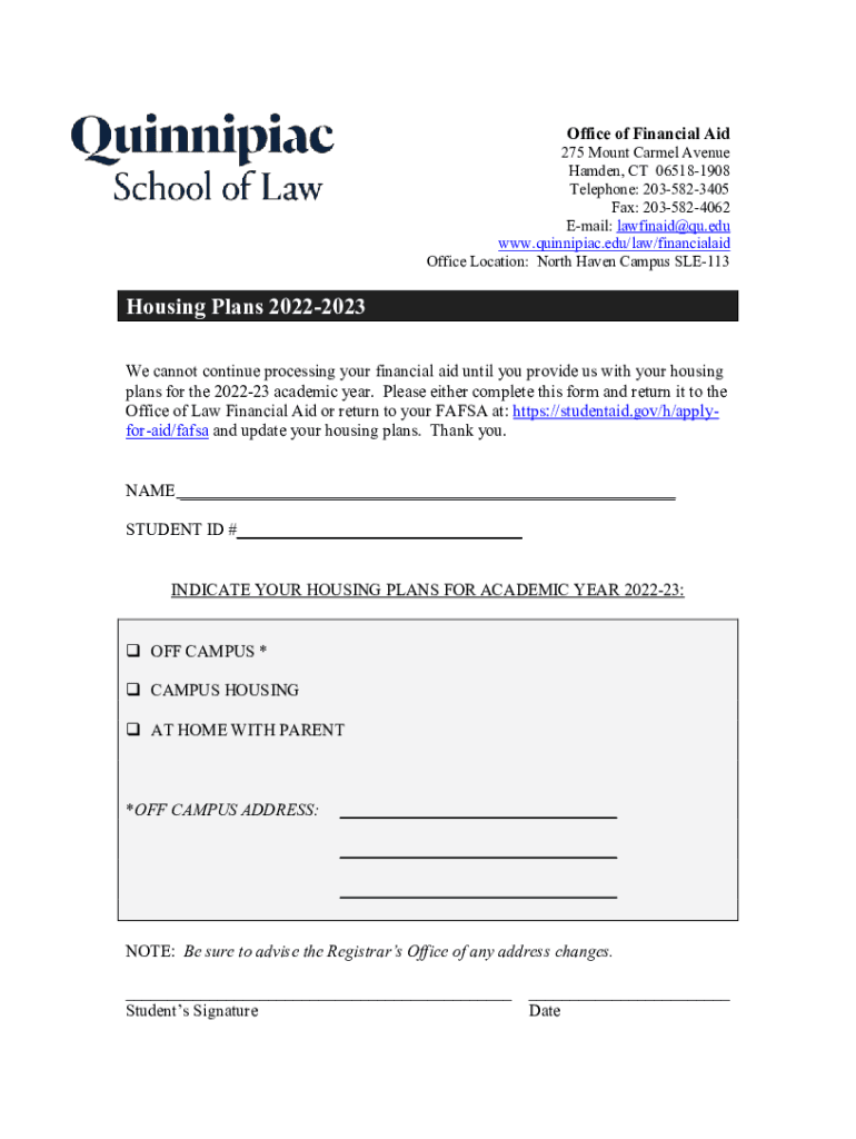 Office of Financial Aid275 Mount Carmel Avenue Hamden, CT 065181908 Telephone: 2035823405 Fax: 2035824062 Email: lawfinaid@qu.edu www.quinnipiac.edu/law/financialaid Office Location: North Haven Campus