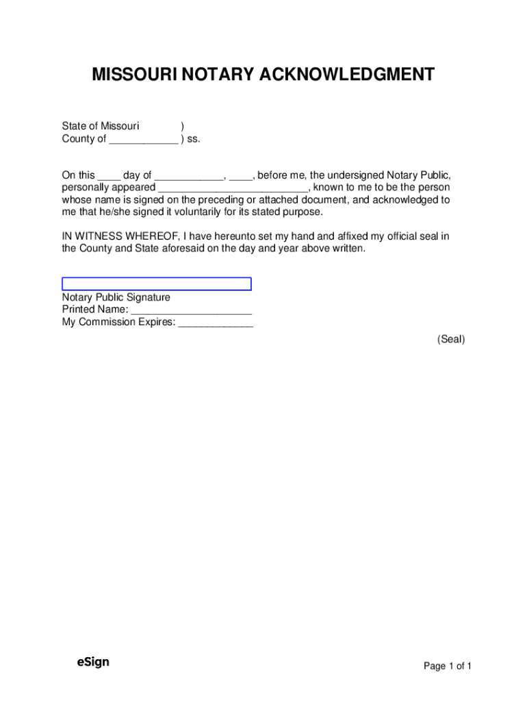 MISSOURI NOTARY ACKNOWLEDGMENT State of Missouri) County of ___) SS. On this ___ day of ___, ___, before me, the undersigned Notary Public, personally appeared ___, known to me to be the person whose