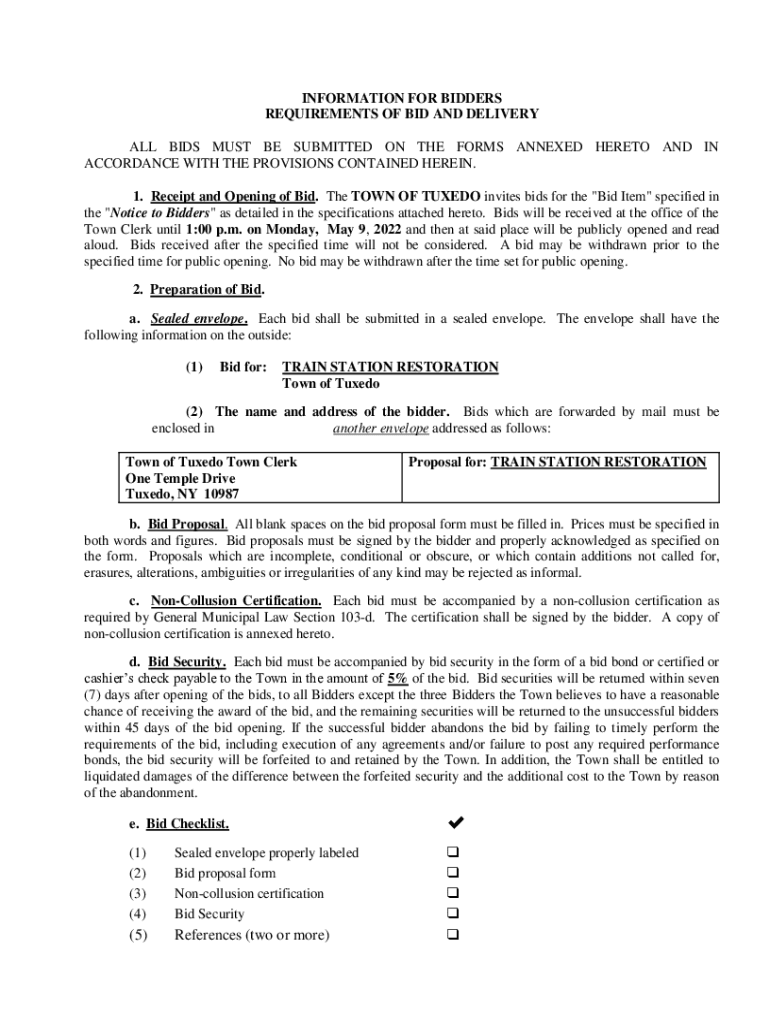 INFORMATION FOR BIDDERS REQUIREMENTS OF BID AND DELIVERY ALL BIDS MUST BE SUBMITTED ON THE FORMS ANNEXED HERETO AND IN ACCORDANCE WITH THE PROVISIONS CONTAINED HEREIN. 1. Receipt and Opening of Bid.