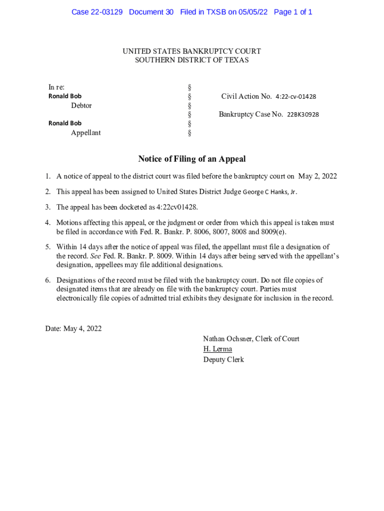 Case 2203129 Document 30 Filed in TSB on 05/05/22-Page 1 of 1UNITED STATES BANKRUPTCY COURT SOUTHERN DISTRICT OF TEXAS In re:Ronald BobDebtorRonald Appellant Civil Action No. 4:22cv01428 Bankruptcy