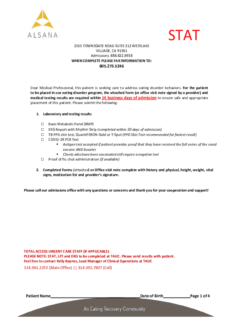 2555 DOWNSTATE ROAD SUITE 312 WESTLAKE VILLAGE, CA 91361 Admissions: 888.822.8938 WHEN COMPLETE PLEASE FAX INFORMATION TO:STAT805.273.5246Dear Medical Professional, this patient is seeking care to
