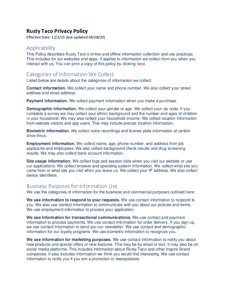 Rusty Taco Privacy Policy Effective Date: 12/2/15 (last updated 04/08/20)Applicability This Policy describes Rusty Tacos online and offline information collection and use practices. This includes
