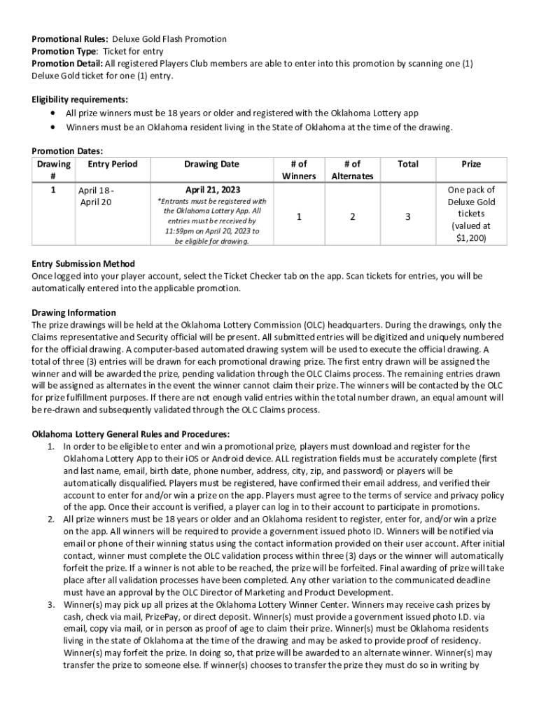 Promotional Rules: Deluxe Gold Flash Promotion Type: Ticket for entry Promotion Detail: All registered Players Club members are able to enter into this promotion by scanning one (1) Deluxe Gold ticket