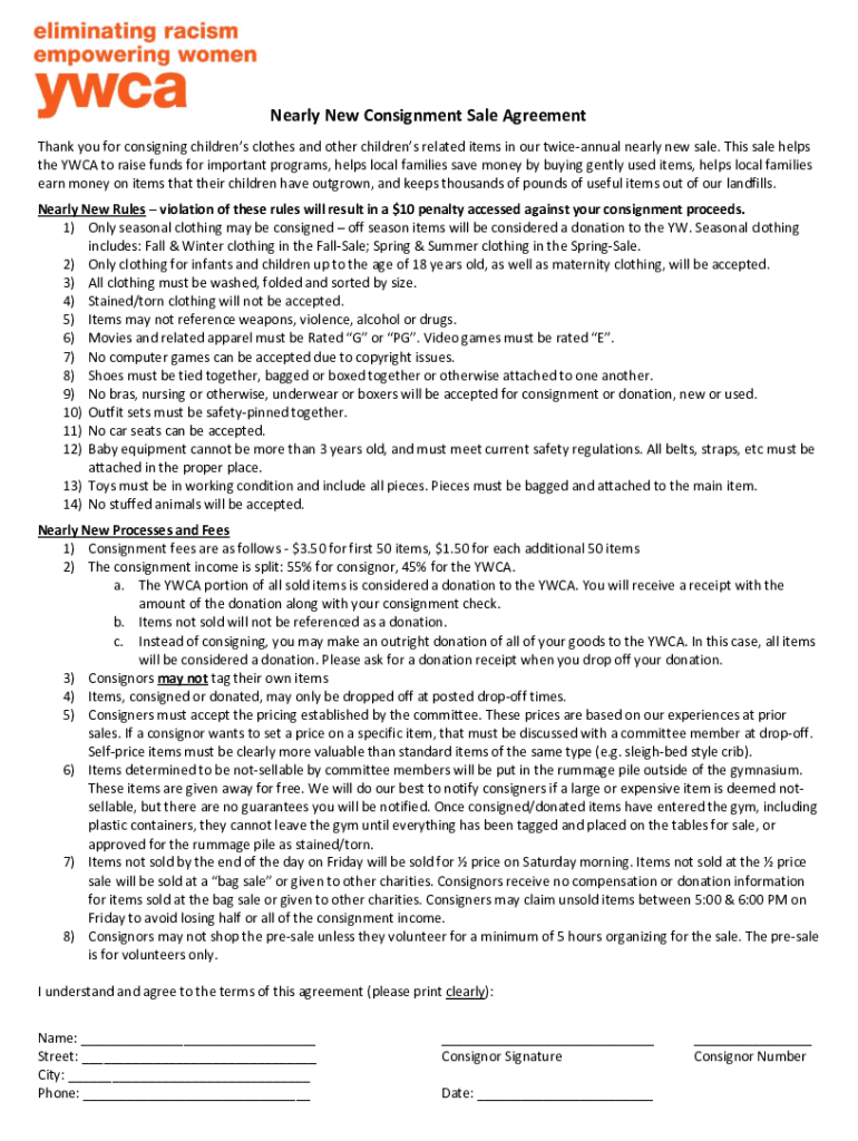 Nearly New Consignment Sale Agreement Thank you for consigning children's clothes and other children's related items in our twice annual nearly new sale. This sale helps the YWCA to raise funds for