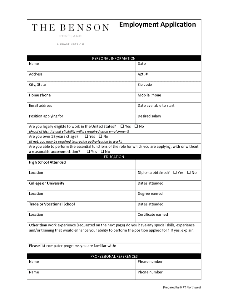 Employment job application forms typically require information such as contact information, work history, education, and references.