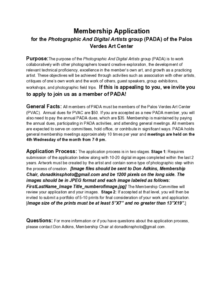 Membership Application for the Photographic And Digital Artists group (PAD) of the Palos Verdes Art Center Purpose:The purpose of the Photographic And Digital Artists group (PAD) is to work collaboratively