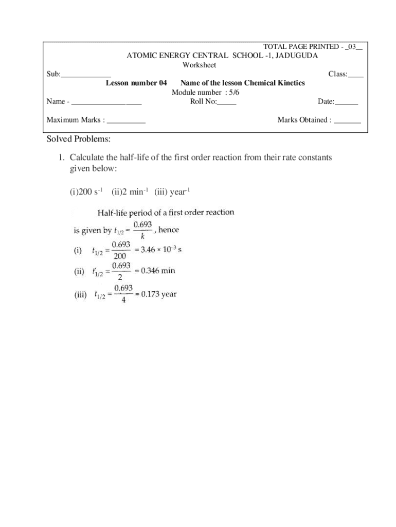 TOTAL PAGE PRINTED _03__ATOMIC ENERGY CENTRAL SCHOOL 1, ARUGULA Worksheet Sub:___ Lesson number 04 Name ___Class:___ Name of the lesson Chemical Kinetics Module number : 5/6 Roll No:___Maximum Marks