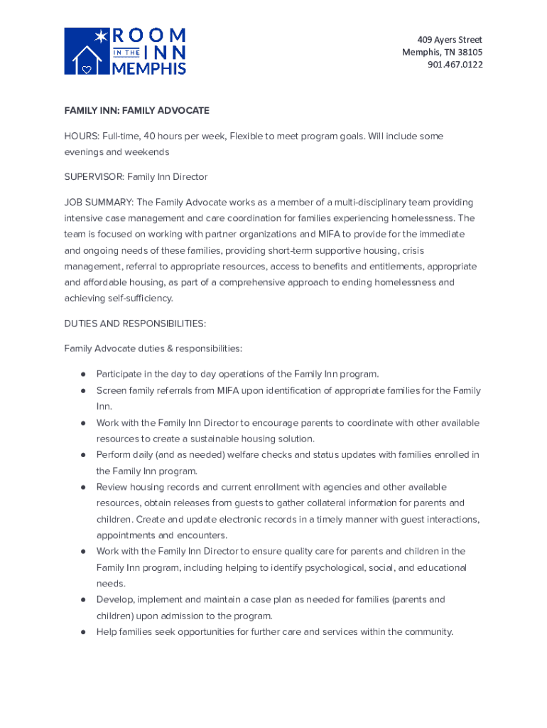 409 Ayers Street Memphis, TN 38105 901.467.0122FAMILY INN: FAMILY ADVOCATE HOURS: Full time, 40 hours per week, Flexible to meet program goals. Will include some evenings and weekends SUPERVISOR:
