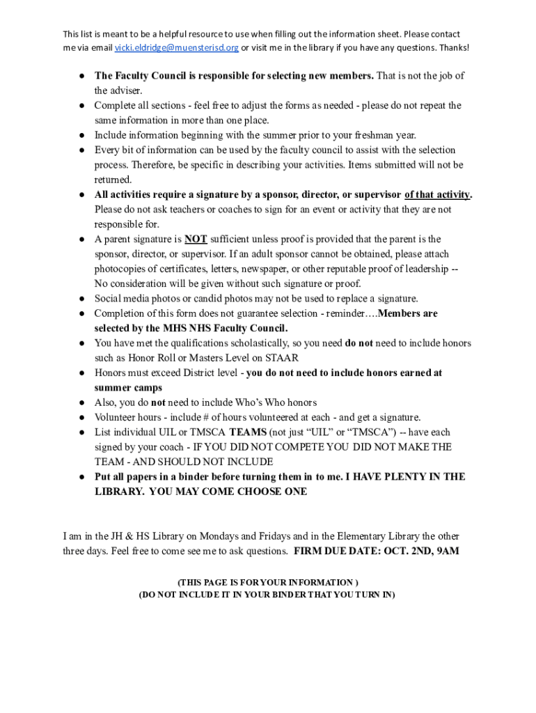 This list is meant to be a helpful resource to use when filling out the information sheet. Please contact me via email vicki.eldridge@muensterisd.org or visit me in the library if you have any questions.