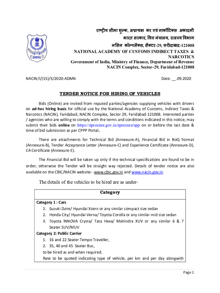 , ,, 29, 121008 NATIONAL Academies OF CUSTOMS Indirect TAXES & NARCOTICS Government of India, Ministry of Finance, Department of Revenue NIACIN Complex, Sector29, Faridabad121008 NIACIN/I/(15)/3/2020ADMNDate: