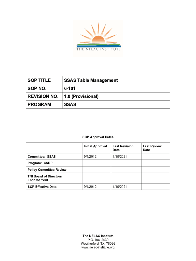 SOP TITLE SSAS Table Management SOP NO.6101REVISION NO.1.0 (Provisional)PROGRAMSSASSOP Approval DatesCommittee: SSASInitial Approvals Revision