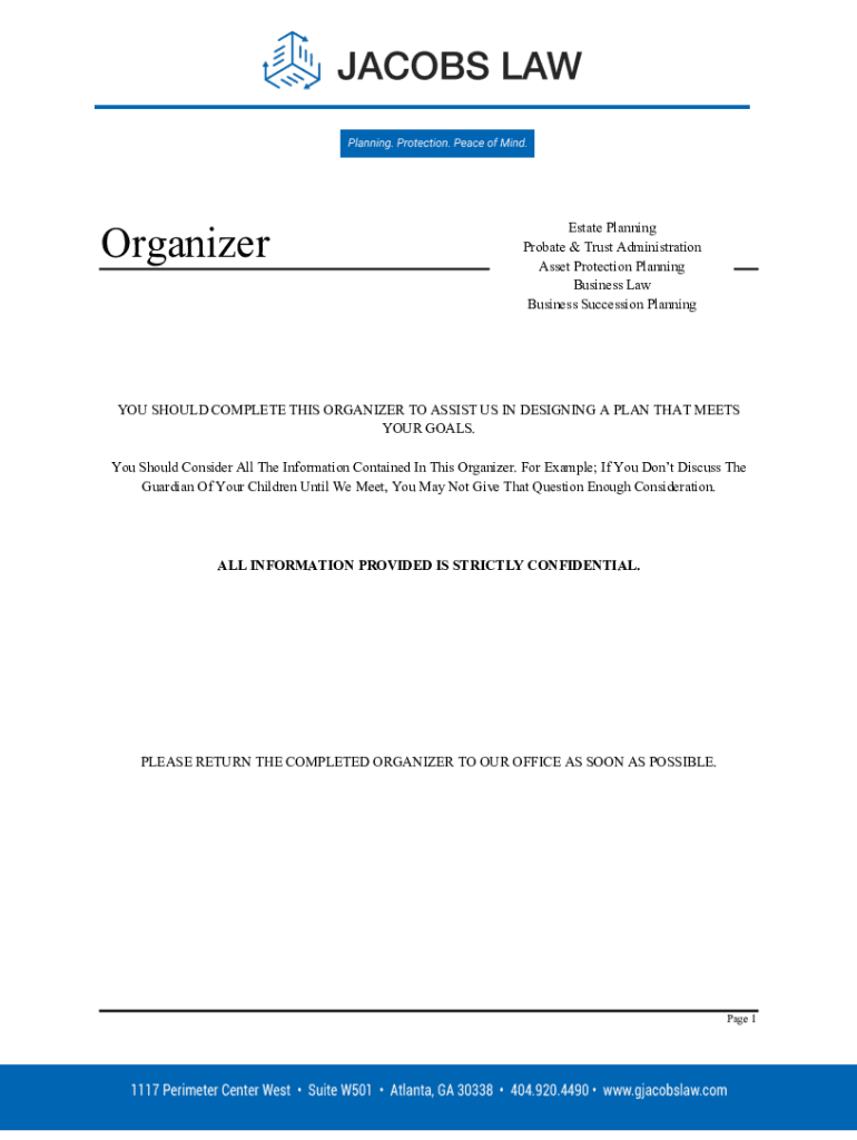 OrganizerEstate Planning Probate & Trust Administration Asset Protection Planning Business Law Business Succession Planning SHOULD COMPLETE THIS ORGANIZER TO ASSIST US IN DESIGNING A PLAN THAT MEETS