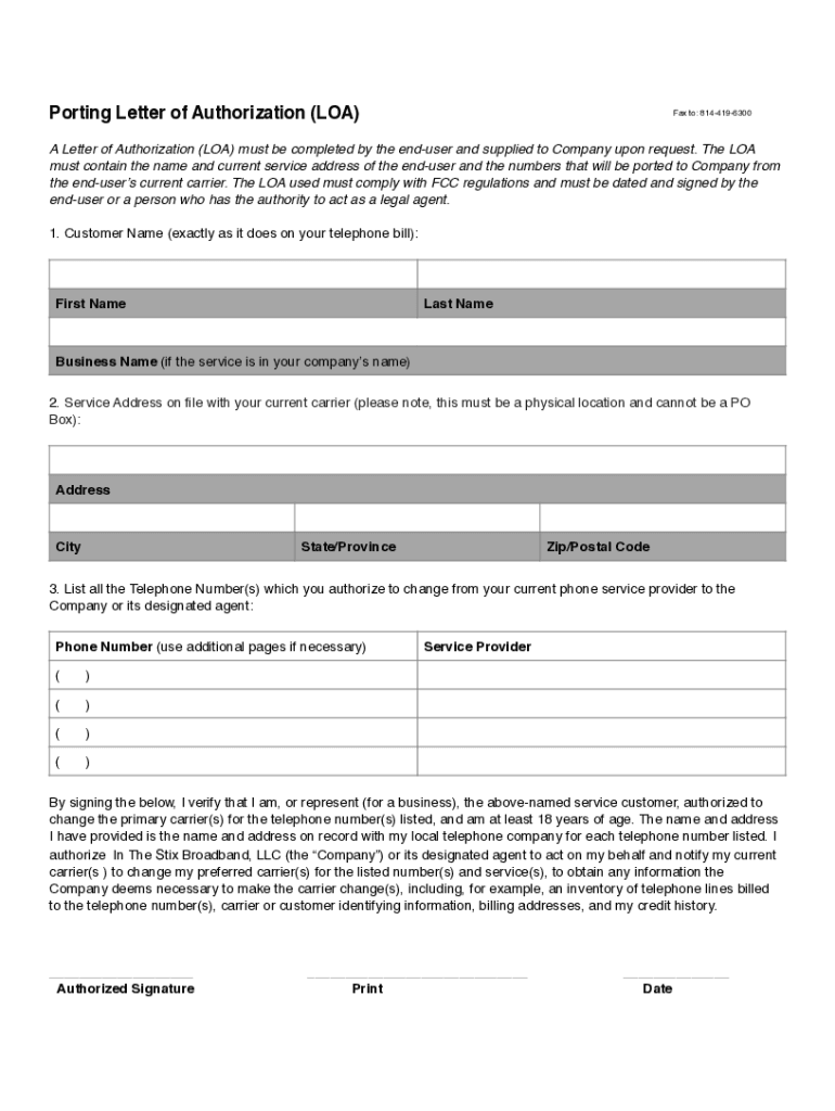 Porting Letter of Authorization (LOA)Fax to: 8144196300A Letter of Authorization (LOA) must be completed by the end user and supplied to Company upon request. The LOA must contain the name and current
