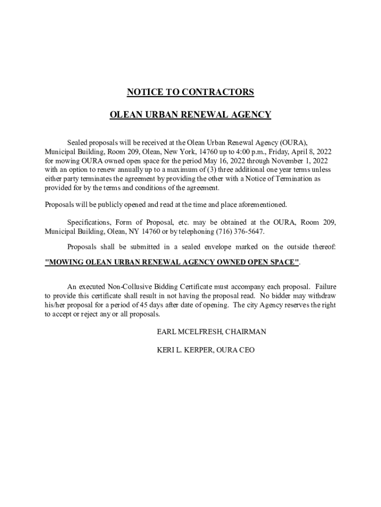 NOTICE TO CONTRACTORS CLEAN URBAN RENEWAL AGENCY Sealed proposals will be received at the Clean Urban Renewal Agency (OUR), Municipal Building, Room 209, Clean, New York, 14760 up to 4:00 p.m., Friday,