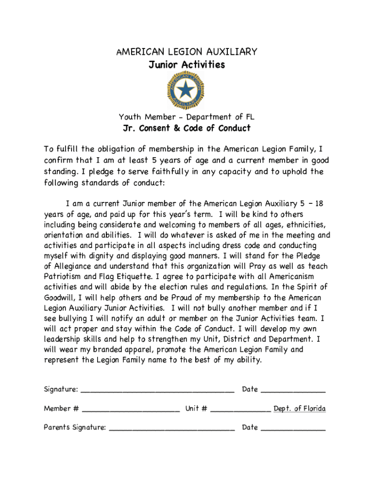 AMERICAN LEGION AUXILIARY Junior ActivitiesYouth Member Department of FL Jr. Consent & Code of Conduct To fulfill the obligation of membership in the American Legion Family, I confirm that I am at