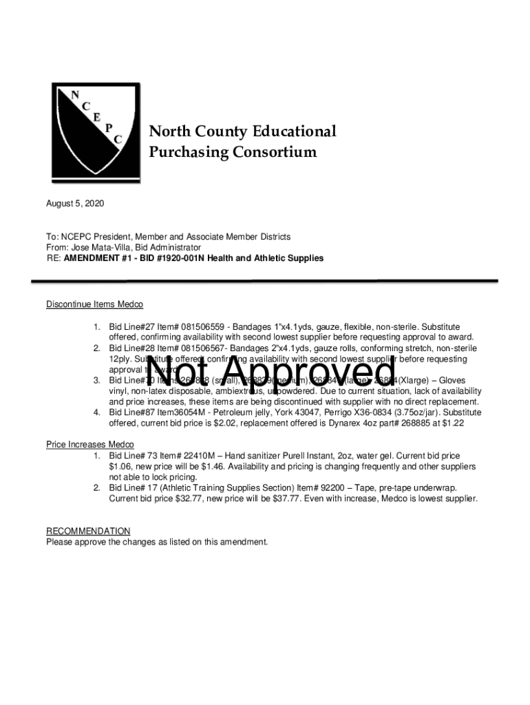 North County Educational Purchasing Consortium August 5, 2020To: NCE PC President, Member and Associate Member Districts From: Jose Matilda, Bid Administrator RE: AMENDMENT #1 BID #1920001 N Health