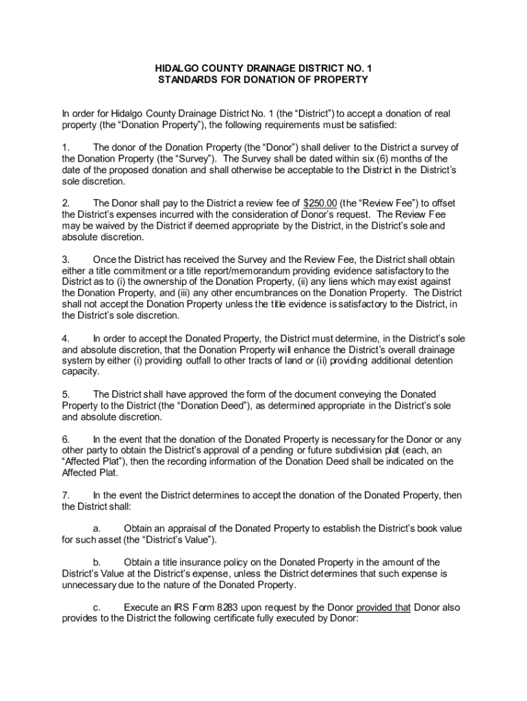 HIDALGO COUNTY DRAINAGE DISTRICT NO. 1 STANDARDS FOR DONATION OF PROPERTY In order for Hidalgo County Drainage District No. 1 (the District) to accept a donation of real property (the Donation Property),