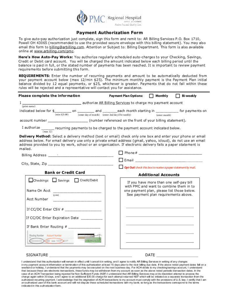 Payment Authorization Form To give autopay authorization just complete, sign this form and remit to: AR Billing Services P.O. Box 1710, Powell OH 43065 (recommended using the provided secure envelope
