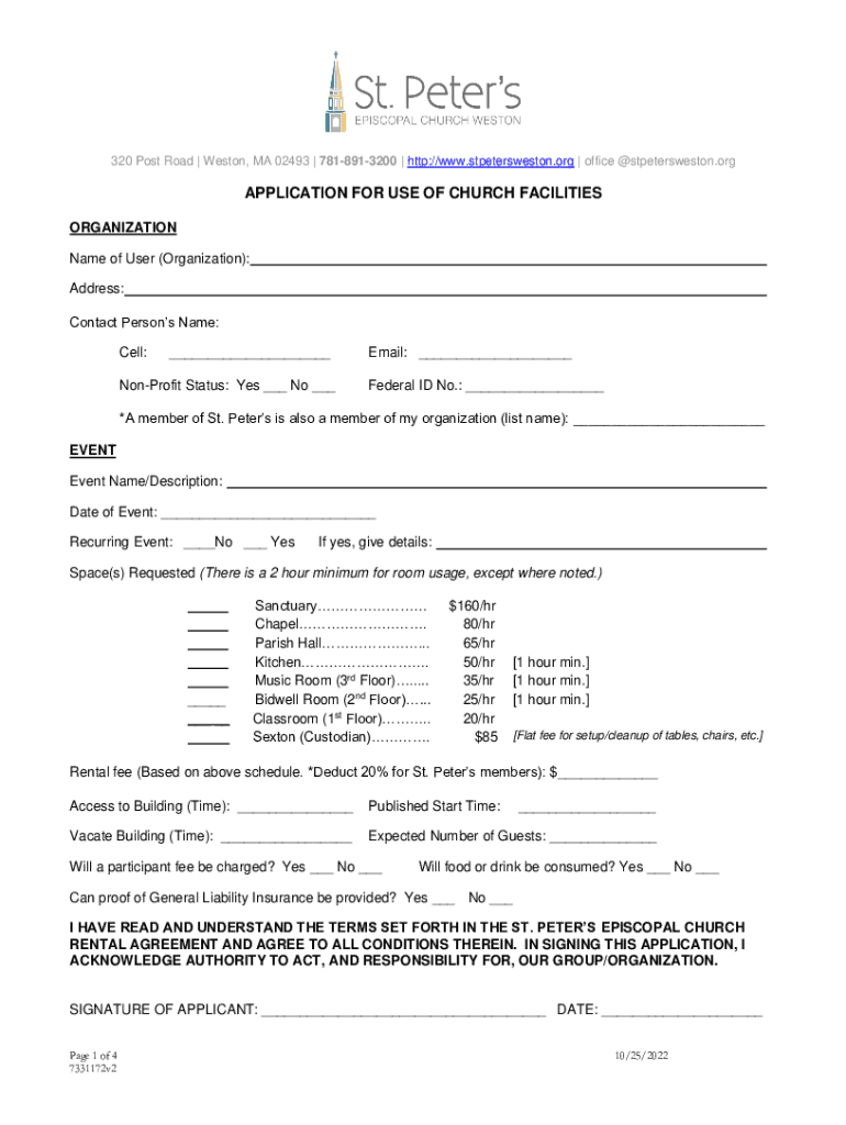 320 Post Road | Weston, MA 02493 | 7818913200 | http://www.stpetersweston.org | office @stpetersweston.reapplication FOR USE OF CHURCH FACILITIES ORGANIZATION Name of User (Organization): Address:
