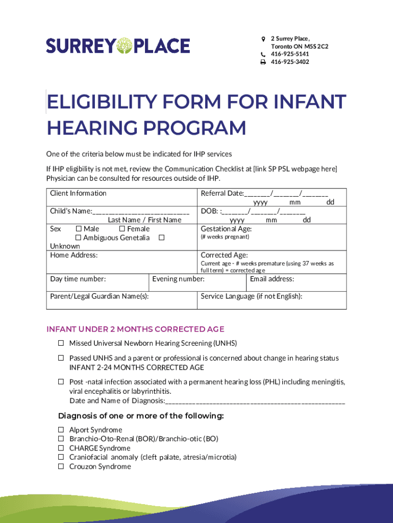 2 Surrey Place, Toronto ON M5S 2C2 4169255141 4169253402ELIGIBILITY FORM FOR INFANT HEARING PROGRAM One of the criteria below must be indicated for IHP services If IHP eligibility is not met, review