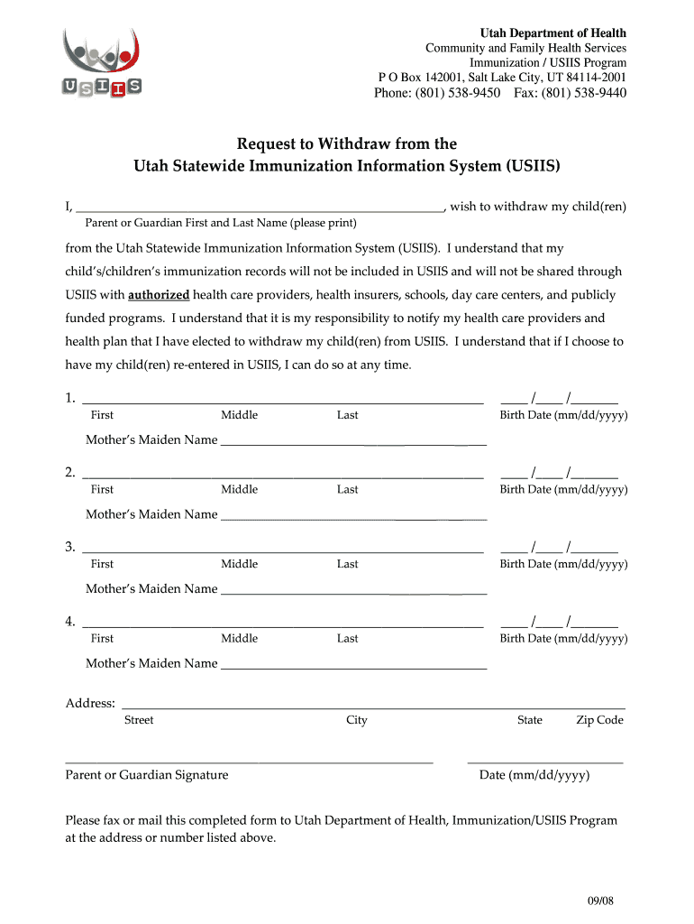 Eligibility to use the Utah USIIS Withdrawal Form is granted to parents or guardians of minors enrolled in the Utah Statewide Immunization Information System. Only those holding legal responsibility for the child(ren) may complete this form.
