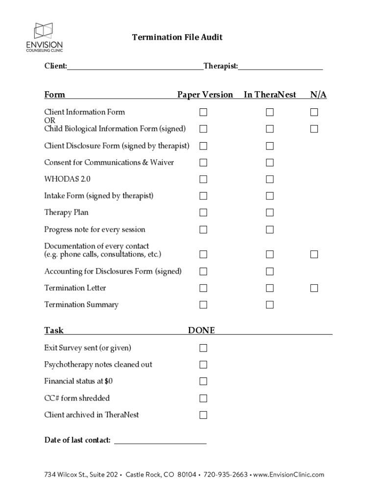 Termination File Multiclient:___Therapist:___Former Versioning Therapist/Client Information Form OR Child Biological Information Form (signed)!!!!!! Client Disclosure Form (signed by therapist)!!