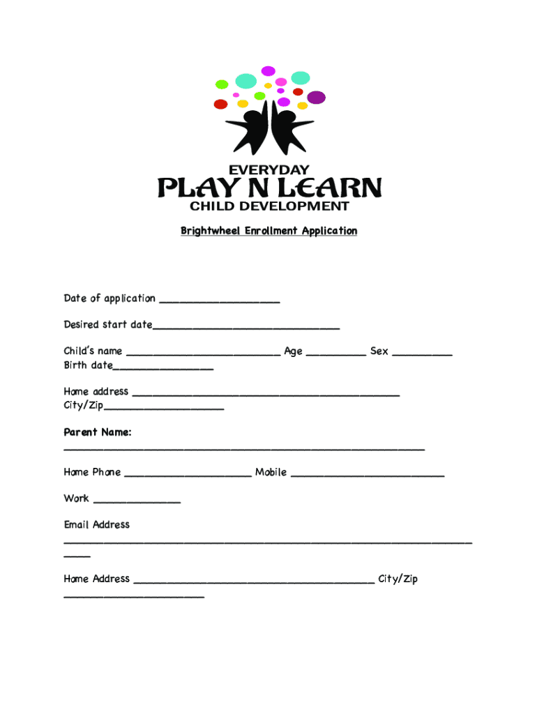 Bright wheel Enrollment ApplicationDate of application ___ Desired start date___ Child's name ___ Age ___ Sex ___ Birth date___ Home address ___ City/Zip___ Parent Name: ___ Home Phone ___ Mobile
