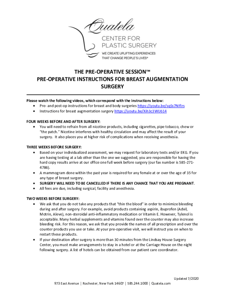 THE PREOPERATIVE SESSION PREOPERATIVE INSTRUCTIONS FOR BREAST AUGMENTATION SURGERY Please watch the following videos, which correspond with the instructions below: PRE and postop instructions for