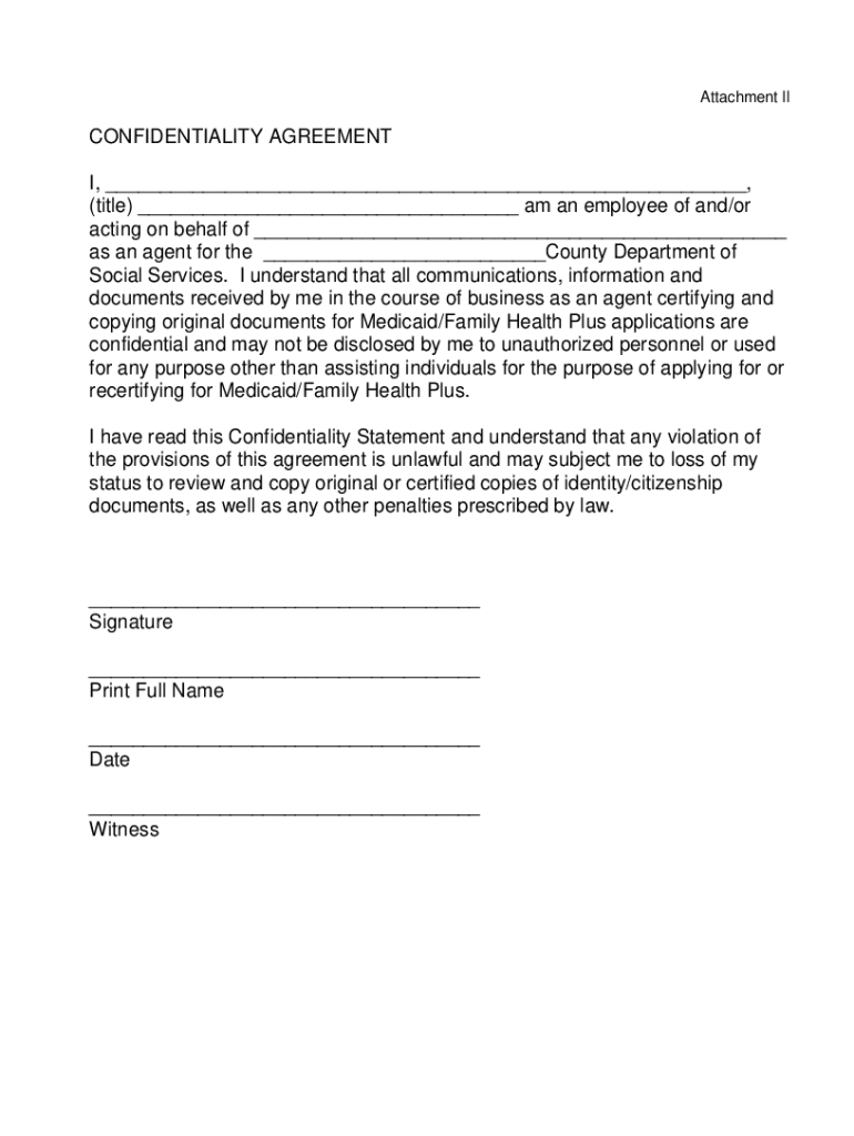 Attachment CONFIDENTIALITY AGREEMENT I, ___, (title) ___ am an employee of and/or acting on behalf of ___ as an agent for the ___County Department of Social Services. I understand that all communications,