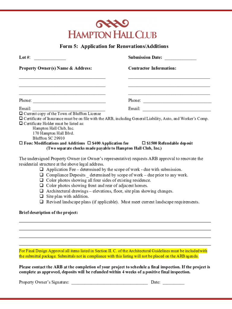 Form 5: Application for Renovations/Additions Lot #: ___Submission Date: ___Property Owner(s) Name & Address:Contractor Information:__________________Phone: ___Phone: ___Email: ___Email: ___ Current
