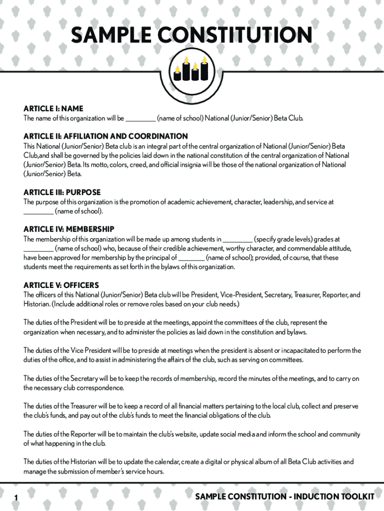SAMPLE CONSTITUTIONARTICLE I: NAME The name of this organization will be ___ (name of school) National (Junior/Senior) Beta Club. ARTICLE II: AFFILIATION AND COORDINATION This National (Junior/Senior)