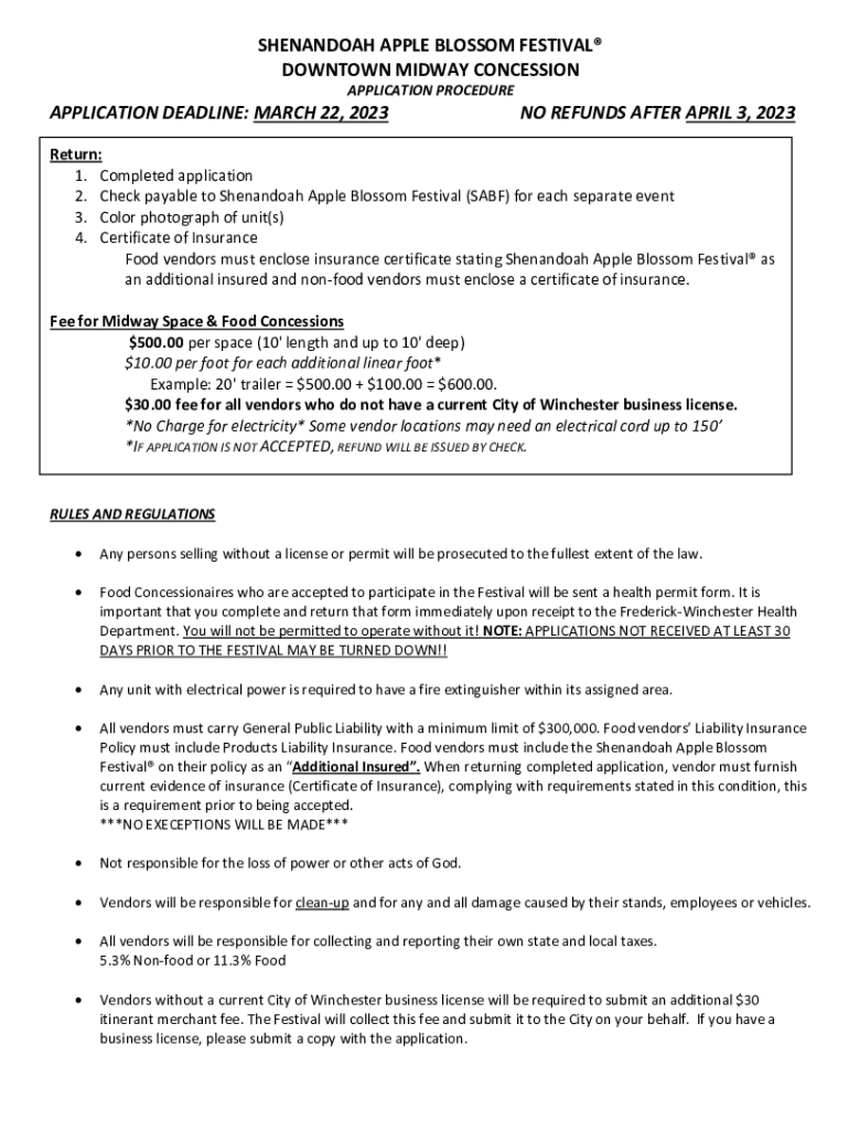 SHENANDOAH APPLE BLOSSOM FESTIVAL DOWNTOWN MIDWAY CONCESSION APPLICATION PROCEDUREAPPLICATION DEADLINE: MARCH 22, 2023NO REFUNDS AFTER APRIL 3, 2023Return: 1. Completed application 2. Check payable