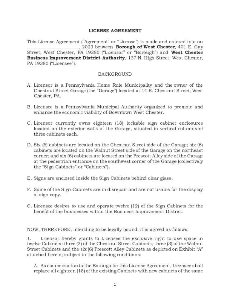 LICENSE AGREEMENT This License Agreement (Agreement or License) is made and entered into on ___, 2023 between Borough of West Chester, 401 E. Gay Street, West Chester, PA 19380 (Licensor or Borough)