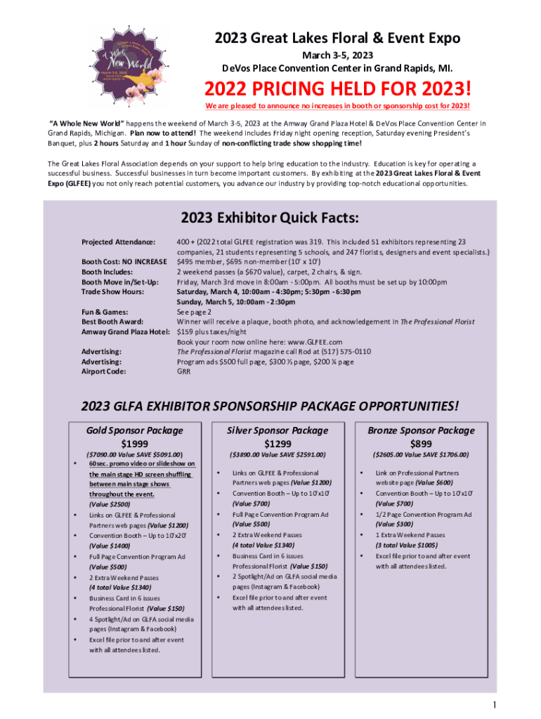 2023 Great Lakes Floral & Event Expo March 35, 2023DeVos Place Convention Center in Grand Rapids, MI.2022 PRICING HELD FOR 2023! We are pleased to announce no increases in booth or sponsorship cost for 2023!