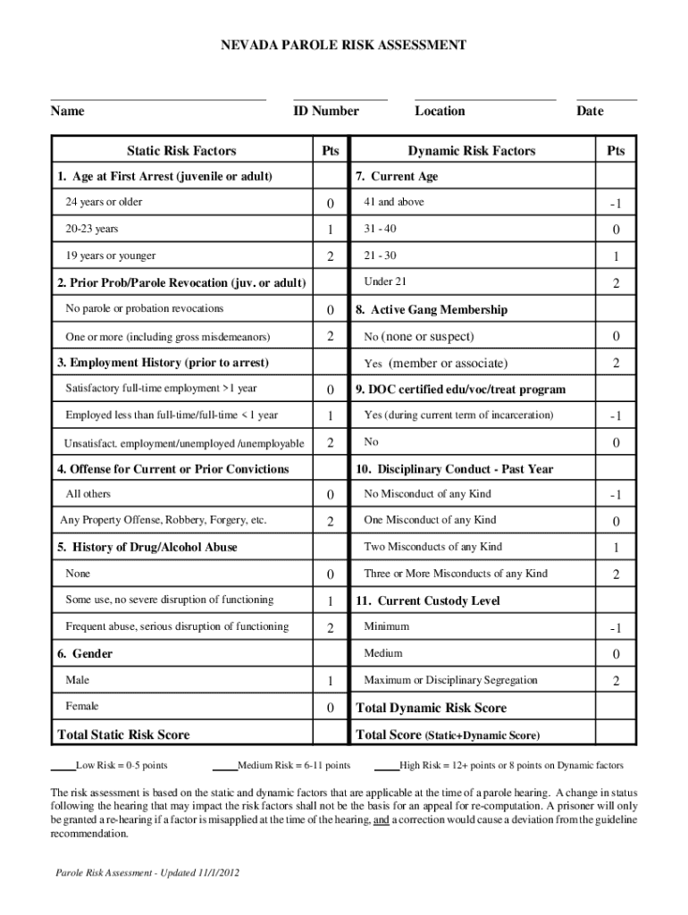 Get the free NEVADA PAROLE RISK ASSESSMENT