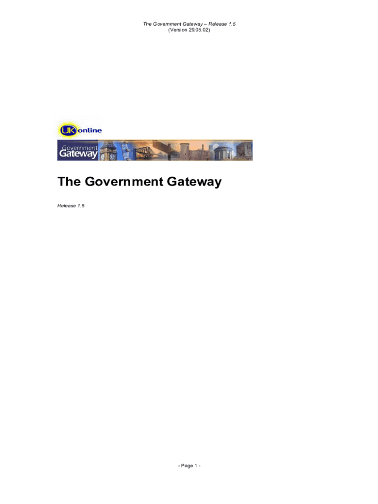 The Government Gateway Release 1.5 (Version 29.05.02)The Government Gateway Release 1.5-Page 1 The Government Gateway Release 1.5 (Version 29.05.02) 2002 Crown Copyright, Office of the envoy. All