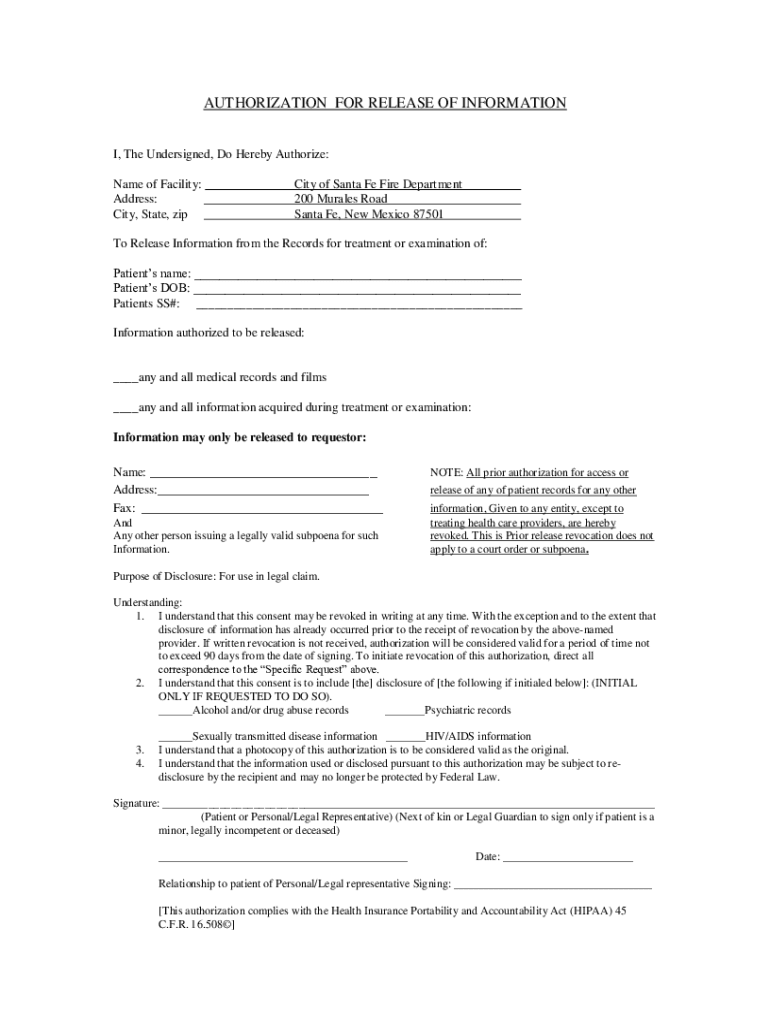 AUTHORIZATION FOR RELEASE OF INFORMATION I, The Undersigned, Do Hereby Authorize: Name of Facility: Address: City, State, SimCity of Santa Fe Fire Department 200 Murals Road Santa Fe, New Mexico 87501To