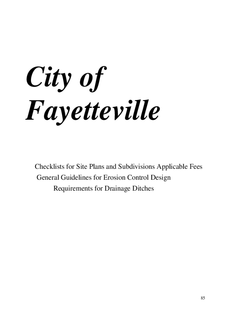 City of Fayetteville Checklists for Site Plans and Subdivisions Applicable Fees General Guidelines for Erosion Control Design Requirements for Drainage Ditches85THE CITY OF FAYETTEVILLE Address: 110