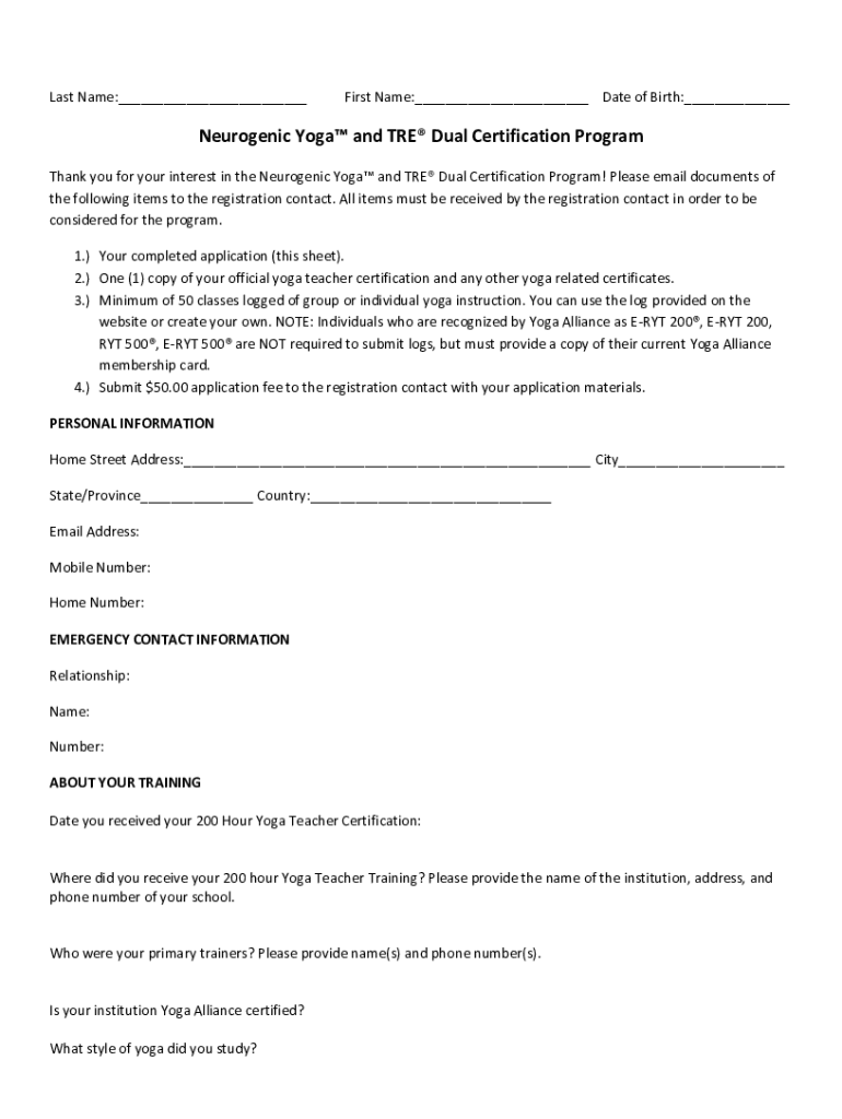 Last Name:___First Name:___ Date of Birth:___Neurogenic Yoga and TRE Dual Certification Program Thank you for your interest in the Neurogenic Yoga and TRE Dual Certification Program! Please email
