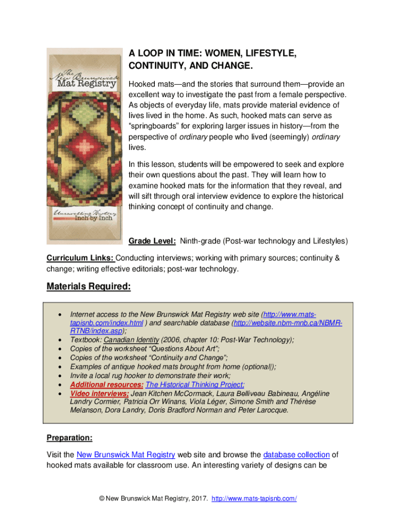 A LOOP IN TIME: WOMEN, LIFESTYLE, CONTINUITY, AND CHANGE. Hooked mat sand the stories that surround them provide an excellent way to investigate the past from a female perspective. As objects of everyday