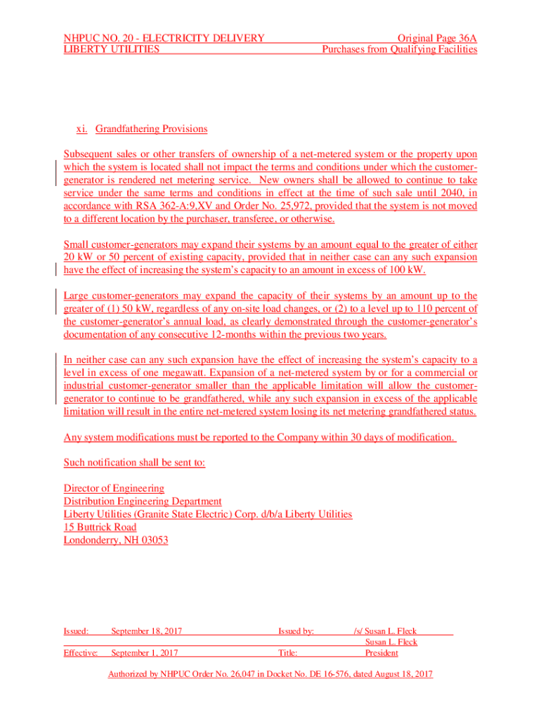 NH PUC NO. 20 ELECTRICITY DELIVERY LIBERTY UTILITIESOriginal Page 36A Purchases from Qualifying Facilities xi. Grandfathering Provisions Subsequent sales or other transfers of ownership of a net metered
