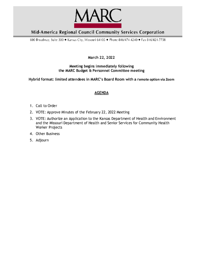 March 22, 2022, Meeting begins immediately following the MARC Budget & Personnel Committee meeting Hybrid format: limited attendees in March Board Room with a remote option via Zoom AGENDA 1. Call